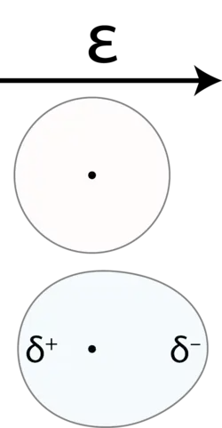 When a molecule is exposed to an electric field ɛ, electron density is polarized away from the nuclei. A dipole is thus created due to the asymmetric distribution of electron density.
