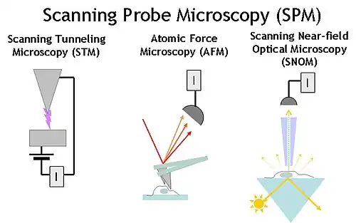 Overview of the main types of Scanning Probe Microscope types: Scanning Tunneling Microscope (STM) - using the tunneling current I between the outermost atom of a conducting probe within an atomic distance from a substrate to map out the sample topography and electrical properties. Atomic Force Microscope (AFM) - using the van der Waals forces or contact forces between a tip and the sample to measure the sample topography or mechanical properties. Scanning Near-field Optical Microscope (SNOM) - using the scattered light through a sub-wavelength aperture to form an image.
