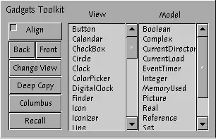 The two lists contain the standard set of visual and model gadgets. Note in passing that 'View' is briefer than 'visual gadget' and 'Model' more concise than 'model gadget'. Also for the user's convenience, the list entries are aliases of the real New procedure names. Clicking on one of the entries in the View list inserts a gadget of that type at the caret position. Clicking on an entry in the Model list links a model gadget of that type to the selected gadget or gadgets. The [Recall] button recalls the last deleted panel (Note: it only works for a panel gadget). The [Columbus] button opens a fresh Columbus panel, and the buttons [Back] and [Front] change the display priority of the selected gadgets. By display priority is meant which gadgets overlap others in a panel. By default, new gadgets are always inserted in front of the gadgets already located in a container, and keep their current priority until it is explicitly changed. One exception is the document gadget; these pop to the front when they are focused. If you want to bring a gadget to the front of the container, the consume interclick combination can be used as a short cut. Notice however that the new consume position is the same container as before, otherwise the gadget may change containers unexpectedly.
