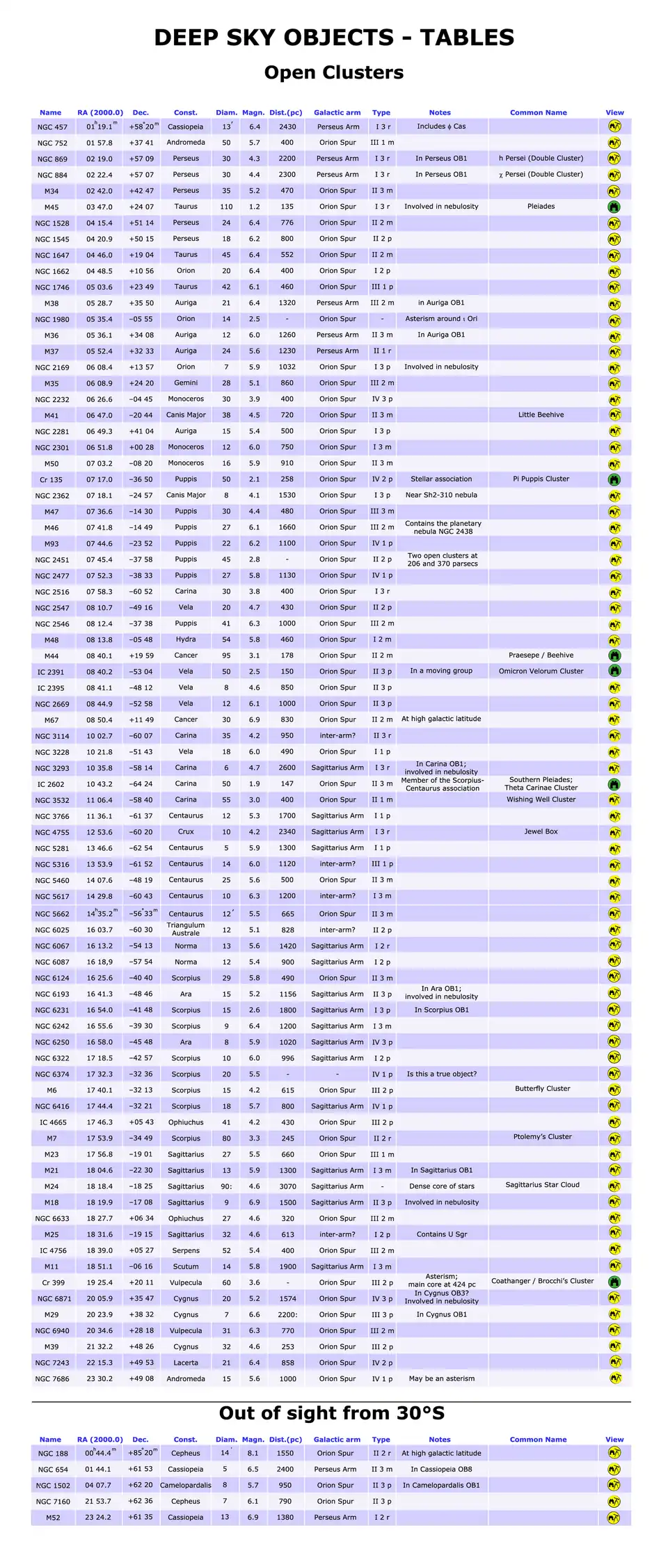 - Notes: notable notes about the cluster, membership in OB associations, nebulosity.