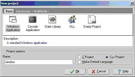 First open up Dev – C++. When it opens up, click on the top menu bar File, New, Project. Make sure the Basic tab is selected and click on Windows Application. Then give it a name and press OK. Then in the next dialog, choose a location on your computer to save and then press Save: