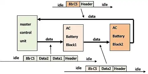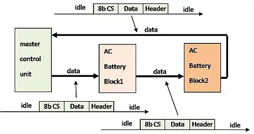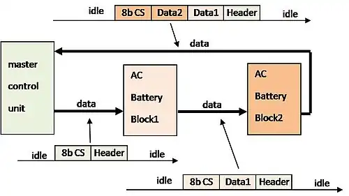The data transfer is always initiated by the master control unit. It sends data to the first battery pack. Then, the first battery pack sends the data to the next battery pack and so on. The last battery pack returns data to the master control unit.