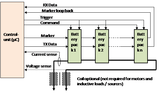 The master control sends a header to communicate the meaning of the requested data and a checksum. The first battery pack adds the requested data and forwards the header, his data and a new checksum to the second battery pack. The next battery pack also appends his data, and so on. After the last battery pack, the master control receives the data of all battery packs in a chain. With this method, it is possible to find out how many battery packs are in a chain and how many switch cells they contain.