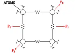 In this example, isotropic elasticity is used, and in all likelihood is a reasonable approximation for bulk polycrystalline or amorphous solids. Sometimes we cannot assume an isotropic solid. This is most common when dealing with systems where single crystals are studied such as the one in Figure 1. Looking at Figure 1, even if , pulling in direction will encounter different resistance (constant of proportionality in Hooke's Law) than pulling in direction .