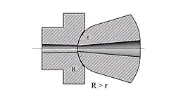 The sprue channel is originated by a sprue bushing that conveys in the channel the plastic flow coming from the nozzle of the press. The sealing of the channel with the nozzle is obtained by contact only, by the force applied from the machine to the cylinder. The following relations are generally respected in order to correctly seal the contact and guarantee easy demolding and no freezing of the zone before the completion of the complete part[1]: