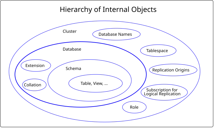 We use the term SQL object for all objects which you can create with the SQL command CREATE ..., e.g.: database, schema, table, view, materialized view, index, constraint, sequence, function, procedure, trigger, role, data type, domain, operator, tablespace, extension, foreign-data wrapper, and much more. Such SQL objects are arranged in a hierarchical manner:
