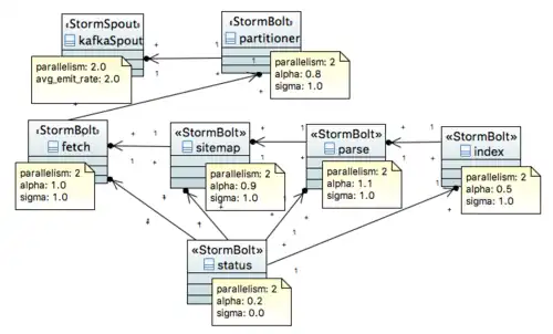 Figure 3 depicts the Storm topology implementing the DigitalPebble web crawler. Each node, either spout or bolt, has been annotated with the parameter values that are required to perform the bottleneck analysis.