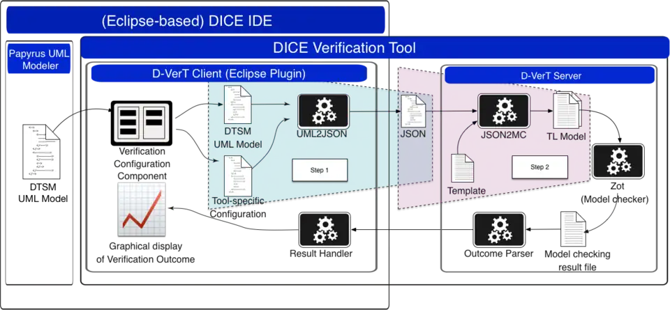 As shown in Figure 2, D-VerT has a client-server architecture: the client component is an Eclipse plugin that is fully integrated with the DICE IDE and the server component is a RESTful web server. The client component manages the transformation from the DTSM model defined by the user to an intermediate JSON object which is then used to invoke the server. The server component, based on the content of the JSON file generates the formal model which is then fed to the core satisfiability/model checking tool. This tool is in charge of verifying if the property holds for the provided set of formulae, i.e., the formal model of the system.