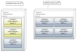 Nodes in the UML activity diagram are grouped by partitions (e.g., Partition1 and Partition2). Each partition is mapped to a computational resource in the UML deployment diagram following the scheduling policy defined for the topology. Next picture shows the deployment diagram, which complements the previous activity diagram. Each computational resource is stereotyped as GaExecHost and defines its resource multiplicity, i.e., number of cores. The deployment also allows one to know which messages exchanged by tasks can introduce network delays, i.e., tuples exchanged between cores in different physical machines, which is of importance for the eventual performance model. Therefore, we use the GaCommHost stereotype. Both stereotypes are inherited from MARTE GQAM.