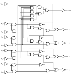 The 4008 is a 4-bit full adder that takes two 4-bit binary numbers, A[3:0] and B[3:0] and carry-in signal, Cin and adds them to produce a 5-bit result, made up of a sum, S[3:0] and a carry-out.