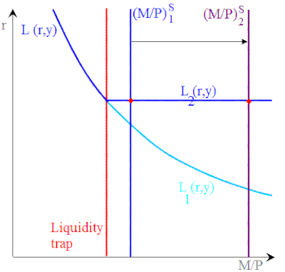 Beyond a certain point (the liquidity trap line), L(r,y), the money demand, becomes perfectly horizontal. Shifts in (M/P)S, the money supply, in this area have no effect on interest rate r. This is what the diagram shows.