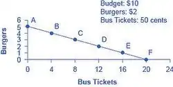 Return to the situation of Lilly’s choice between paperback books and doughnuts. Say that books cost $6, doughnuts are 50 cents each, and that Lilly has $60 to spend. This information provides the basis for the budget line shown in [link]. Along with the budget line are shown the three indifference curves from [link]. What is Lilly’s utility-maximizing choice? Several possibilities are identified in the diagram.