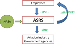 Figure 1 illustrates how the ASRS works. Any employee in the aviation industry can report a mistake or unprofessional behavior to the ASRS. The ASRS is administered by NASA, which functions as an independent third party. NASA de-identifies the reports and compiles them into a publicly searchable database.[2] This information is used by the aviation industry and government agencies such as the Federal Aviation Administration and National Transportation Safety Board to improve safety by issuing alerts, making policy changes,[3] and communicating safety trends through newsletters to the aviation community. In return, the employee is granted immunity from prosecution.[3] If an employee is suspected of negligence or professional misconduct through an independent investigation, the employee can use this immunity if an ASRS report was filed. This immunity can be exercised once every five years.