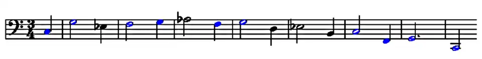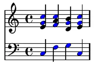 In harmony theory, the four Pythagorean tones are of great importance, as they form the framework of one of the most frequently used final cadences consisting of tonic, subdominant, dominant and tonic. The folowing example shows the cadence C major - F major - G major - C major with the respective root of the four chords in the bass voice.
