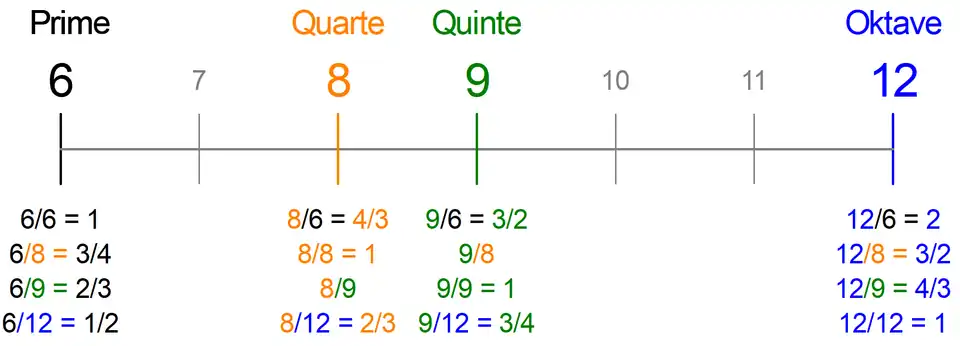 The ratios observed here with the products of the two natural numbers two and three correspond to the consonant intervals octave, fifth, fourth and prime. In relation to any fundamental, the corresponding four Pythagorean tones result in a so-called tetrachord.