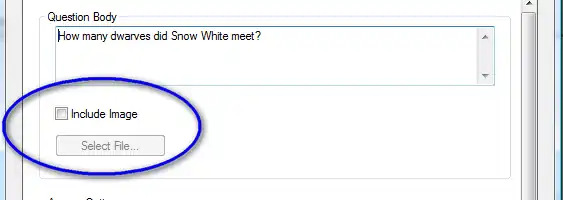 To add an image, simply tick the include image box and then use the browser to select and insert the image of your choice. The image should be in a .jpg or .gif format. Once you have selected the image you want using the Add Files... button you click the Use File button and the image will appear in your question.