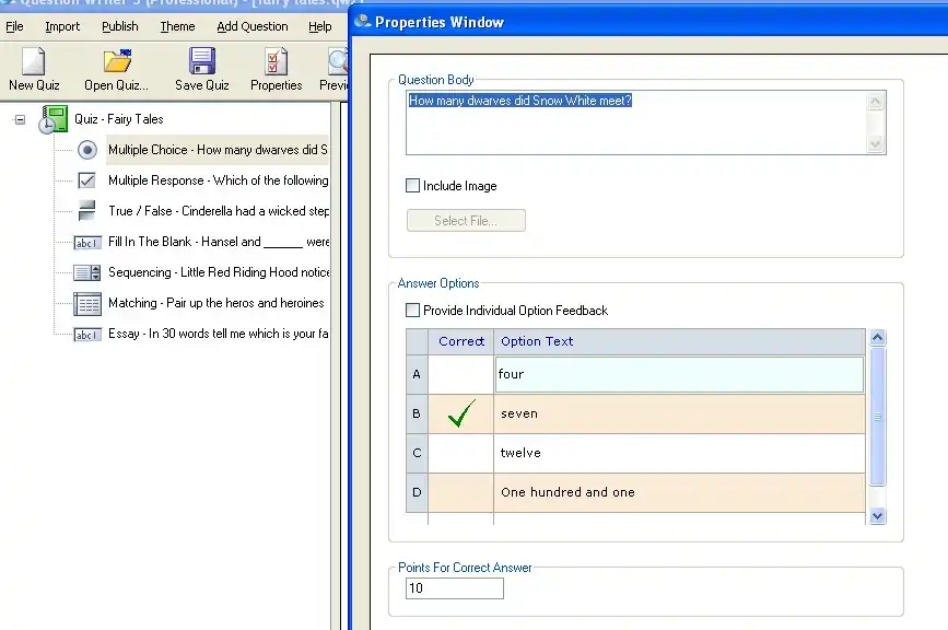When you select the question type a properties window will open. As well as entering the specific details of the question and answer, the properties window for each question type gives you the option to add an image, set the score and decide on the appropriate feedback for that particular question.