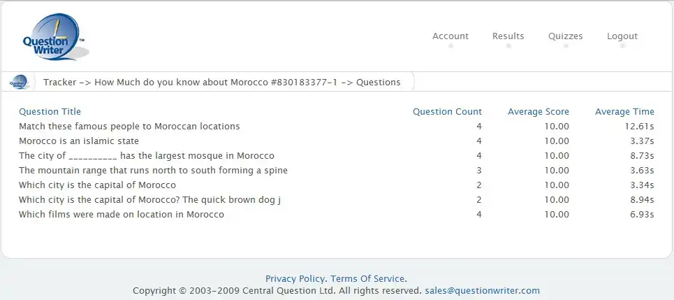 You can delete a quiz by clicking on the red cross beside the name, or you can click on the white question mark in the dark blue circle and see a list of all the questions in that quiz along with some statistics on the scoring for that question.