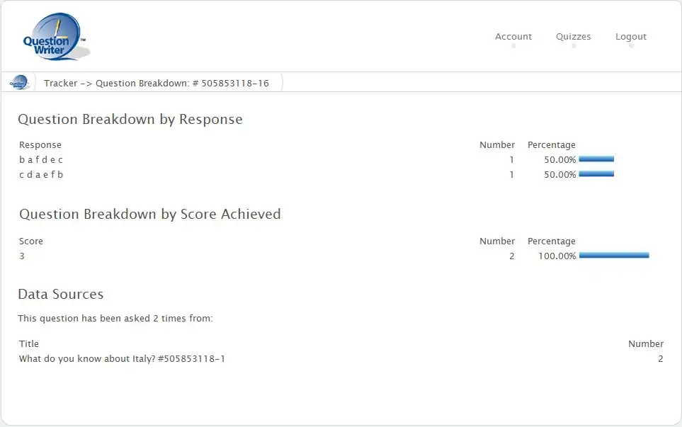 - You can host your quizzes on your own webserver - Question Writer Tracker will still process an unlimited number of result sets from your quiz, so you can log-in and analyse those results, or download them to view in Excel.