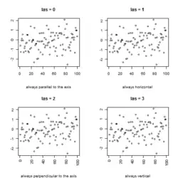 x1 <- rnorm(100) par(mfrow = c(2,2)) plot(x1, las = 0, main = "las = 0", sub = "always parallel to the axis", xlab = "", ylab = "") plot(x1, las = 1, main = "las = 1", sub = "always horizontal", xlab = "", ylab = "") plot(x1, las = 2, main = "las = 2", sub = "always perpendicular to the axis", xlab = "", ylab = "") plot(x1, las = 3, main = "las = 3", sub = "always vertical", xlab = "", ylab = "") |