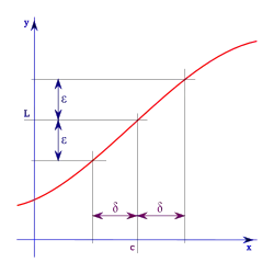 Given a function ƒ; a limit L; and an approaching value c, ∀ε > 0, ∃δ > 0 such that ∀x, .