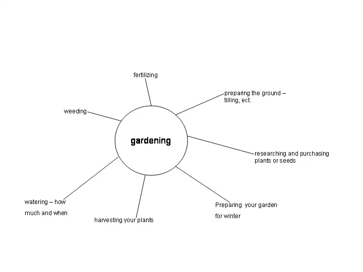 After using the brainstorm example, let's say you decided on gardening as your topic. Your main idea of gardening would be in the center of your page circled. Anything else that you want to say about gardening you would connect to the circle with lines. You can also add more lines to extend the ideas that relate to thoughts around the circle. When finished, your clustering might look like the following:
