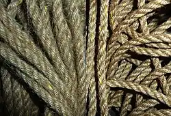 Directly after you made your rope, and also after washing, it is a good idea to stretch the rope. Adjust one end somewhere and pull at the other end as hard as you can! If you are stretching your rope after washing or dying, it is required stretching it for a couple of days. This is also referred to as "drying under load".
