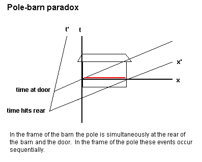 The resolution of the “paradox” lies in the relativity of simultaneity. The closing of the two doors is measured to be simultaneous by the ground observer. However, since the doors are at different positions, the runner says that they do not close simultaneously. The rear door closes and then opens first, allowing the leading edge of the pole to exit. The front door of the barn does not close until the trailing edge of the pole passes by.