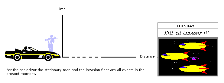 A result of the relativity of simultaneity is that if the car driver launches a space rocket towards the Andromeda galaxy it might have a several days head start compared with a space rocket launched from the ground. This is because the "present moment" for the moving car driver is progressively advanced with distance compared with the present moment on the ground. The present moment for the car driver is shown in the illustration below: