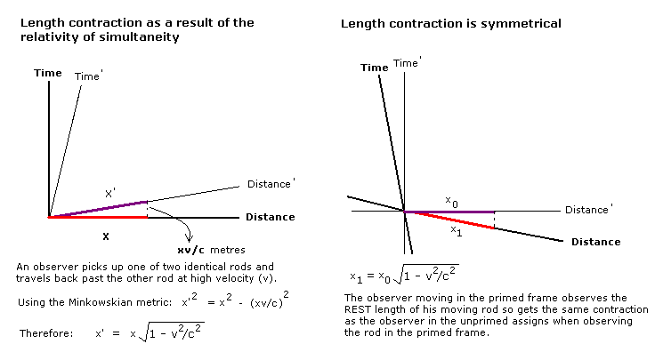 The way that measuring rods differ between observers can be seen by using a Minkowski diagram. The area of a Minkowski diagram that corresponds to all of the events that compose an object over a period of time is known as the worldtube of the object. It can be seen in the image below that length contraction is the result of individual observers having different sections of an object's worldtube in their present instant.