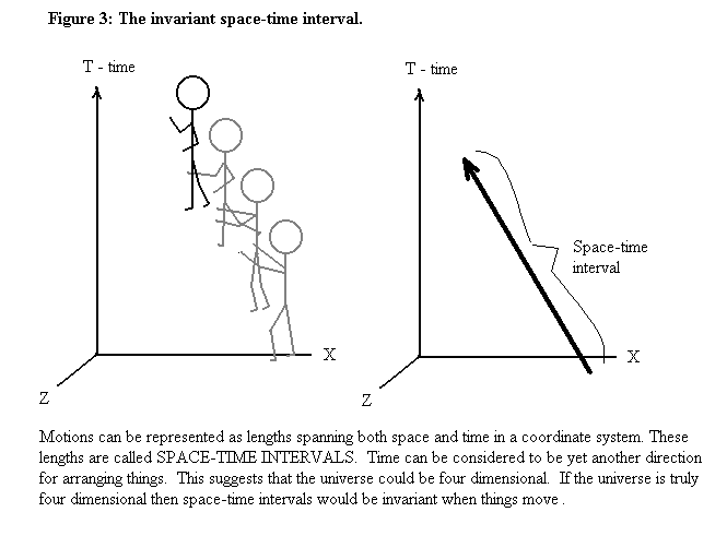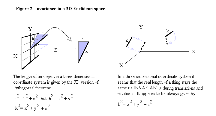 The modern approach uses the concept of invariance to explore the types of coordinate systems that are required to provide a full physical description of the location and extent of things. The modern theory of special relativity begins with the concept of "length". In everyday experience, it seems that the length of objects remains the same no matter how they are rotated or moved from place to place. We think that the simple length of a thing is "invariant". However, as is shown in the illustrations below, what we are actually suggesting is that length seems to be invariant in a three-dimensional coordinate system.
