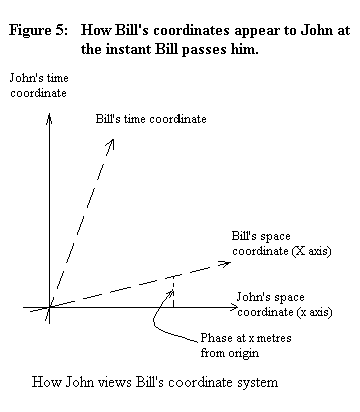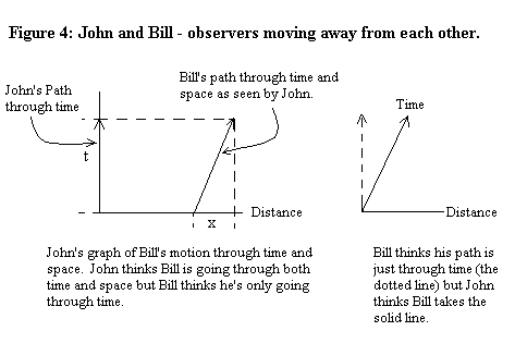 Being on planets, both Bill and John think they are stationary, and just moving through time. John spots that Bill is moving through what John calls space, as well as time, when Bill thinks he is moving through time alone. Bill would also draw the same conclusion about John's motion. To John, it is as if Bill's time axis is leaning over in the direction of travel and to Bill, it is as if John's time axis leans over.