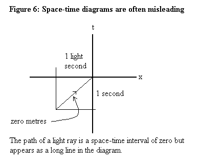 Great care is needed when interpreting space-time diagrams. Diagrams present data in two dimensions, and cannot show faithfully how, for instance, a zero length space-time interval appears.