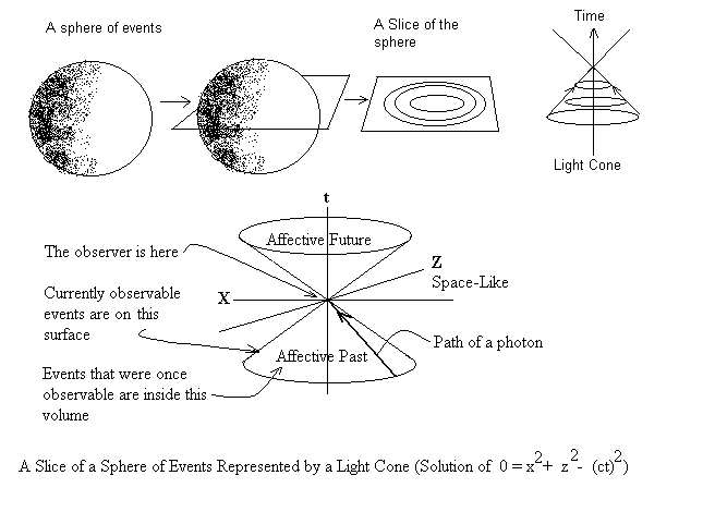 However, there is more to the light cone than the propagation of light. If the added assumption is made that the speed of light is the maximum possible velocity then events that are space separated cannot affect the observer directly. Events within the backward cone can have affected the observer so the backward cone is known as the "affective past" and the observer can affect events in the forward cone hence the forward cone is known as the "affective future".