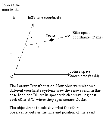 The discussion so far has involved the comparison of interval measurements (time intervals and space intervals) between two observers. The observers might also want to compare more general sorts of measurement such as the time and position of a single event that is recorded by both of them. The equations that describe how each observer describes the other's recordings in this circumstance are known as the Lorentz Transformation Equations. (Note that the symbols below signify coordinates.)
