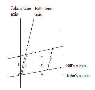 In the diagram above John is conventionally stationary. Distances between two points according to Bill are simple lengths in space (x) all at t=0 whereas John sees Bill's measurement of distance as a combination of a distance (X) and a time interval (T):