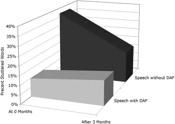 - A single-subject study with an eleven-year-old boy found that fourteen hours of structured therapy with mediated learning and a Casa Futura Technologies DAF device reduced stuttering from 9% dysfluencies to 5% dysfluencies (when speaking without the device). One year later his stuttering was still 5% dysfluencies. Another fourteen hours of similar treatment reduced his stuttering to 4% dysfluencies.[2]