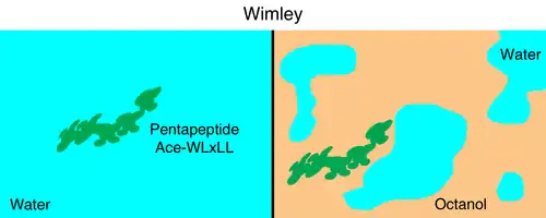 Wimley and White developed a peptide-based system to derive a thermodynamic scale between amino acid side-chain residues and lipids. [6]. The pentapeptide which Wimley and White used was Ace-WLxLL, where x can be any of the 20 naturally occurring amino acids. Water was used as the polar layer and 1-octanol was used as the lipophilic layer, and the partitioning between the two layers was measured. The partitioning between water and 1-palmitoyl-2-oleoyl-sn-glycero-3-phosphocholine (POPC) was also measured via equilibrium dialysis and reverse-phase high-performance liquid chromatography (HPLC).
