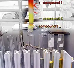 Column chromatography is another method used to separate proteins or molecules from each other. It is essentially an upside-down version of TLC (Thin Layer Chromatography) - relying on the same physical principles, except that while TLC is driven by capillary forces for moving the solvent, column chromatography allows gravity to drive down the eluent. In this method, a sample to be separated is applied to the top of a glass column. the glass column is then packed with a solid phase. The purpose of this solid phase is to separate the compounds in the sample into different zones. Silica gel (SiO2) and alumina (Al2O3) are common adsorbents. The one expected to percolate out of the column first is the component that has the least interactions with the silica gel, so therefore the one that is least polar. The eluent carries the soluble compounds with it. When the column is packed with Silica Gel, the band expected to percolate out of the column first is the component that has the least interactions with the silica gel, so therefore the one that is least polar. The eluent carries the soluble compounds with it. The polarity of the eluent can be progressively increased from a nonpolar solvent to a polar solvent because as the nonpolar component is collected first, the bands of components left in the column are more polar. A more polar solvent would be more efficient to carry the polar component left in the column. After column chromatography is used to separate the mixture according to their respective polarities, Thin Layer chromatography should be used to separate the mixtures to observe the fractions separation and combine any that have “climbed” the same distance. The compounds found to have the same polarities using TLC are combined and analyzed by taking their respective melting points and comparing them to literature values. The amount of sample is used to figure out the initial concentration of each in the original sample. If the compound is colored this is easy, however if the compound is a clear solution then the plates can be CAM stained (Iodine can also be used) or put under UV to track their location. After these bands are collected, the solution can be put under a rotovap to evaporate off the solvent and a clean compound can be obtained. If the solvent is volatile, it can be evaporated in the hood or over night. The samples can also be heated in a sand bath.