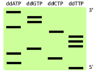 Because large fragments are difficult to sequence, it is necessary to work with small fragments. Frederick Sanger designed a method that controlled replication termination. In this remarkably simple technique, a 2',3'-dideoxy analog is used to initiate chain termination. Each reaction tube contains A, G, T, and C dideoxy analogs along with regular radioactively labeled dNTPs. Each reaction set is run in one column of an electrophoresis gel after the controlled replication termination. Since replication terminates after the random incorporation of a dideoxy analog, the shortest fragments, which run the farthest, are the first group of bases in the sequence.