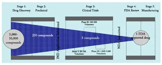 It is not just in the research stage that a potential drug can be rejected. Sometimes even after years of development and progression, a drug can fail in clinical trials or another complication could arise even after much time and money had been invested.