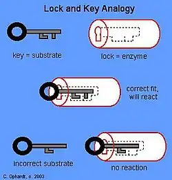In the Lock and Key Model, first presented by Emil Fisher, the lock represents an enzyme and the key represents a substrate. It is assumed that both the enzyme and substrate have fixed conformations that lead to an easy fit. Because the enzyme and the substrate are at a close distance with weak attraction, the substrate must need a matching shape and fit to join together. At the active sites, the enzyme has a specific geometric shape and orientation that a complementary substrate fits into perfectly. The theory behind the Lock and Key model involves the complementarity between the shapes of the enzyme and the substrate. Their complementary shapes make them fit perfectly into each other like a lock and a key. According to this theory, the enzyme and substrate shape do not influence each other because they are already in a predetermined perfectly complementary shape. As a result, the substrate will be stabilized. This theory was replaced by the induced fit model which takes into account the flexibility of enzymes and the influence the substrate has on the shape of the enzyme in order to form a good fit.