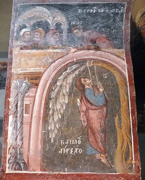 Detail of the wall painting showing the suicide of Judas. St. Nicetas Church. Banjani, Macedonia. XIV c.