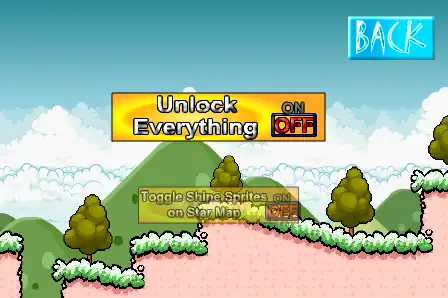 (DOES NOT WORK ON OLDER VERSIONS) On the main menu with the options Story, Extras, and Options, type in "cheat". You'll be taken to a new menu with two options: "Unlock Everything", which unlocks everything on the next file you choose, and "Toggle Shine Sprites on Star Map", which allows you to click on the Shine Sprites and Star Coins on the Star Map, allowing you to get every Shine Sprite and Star Coin by simply clicking.