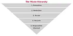As the hierarchy shows, prevention in the first place has the most effect, followed by reduction, reuse and recycling. Putting in place the first four steps significantly reduces the need for the final step, responsible disposal: