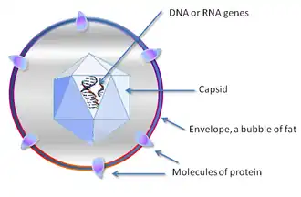 A virus particle, known as a virion, consists of genes made from DNA or RNA which are surrounded by a protective coat of protein called a capsid.[18] The capsid is made of many smaller, identical protein molecules which are called capsomers. The arrangement of the capsomers can either be icosahedral (20-sided), helical or more complex. There is an inner shell around the DNA or RNA called the nucleocapsid, which is formed by proteins. Some viruses are surrounded by a bubble of lipid (fat) called an envelope.