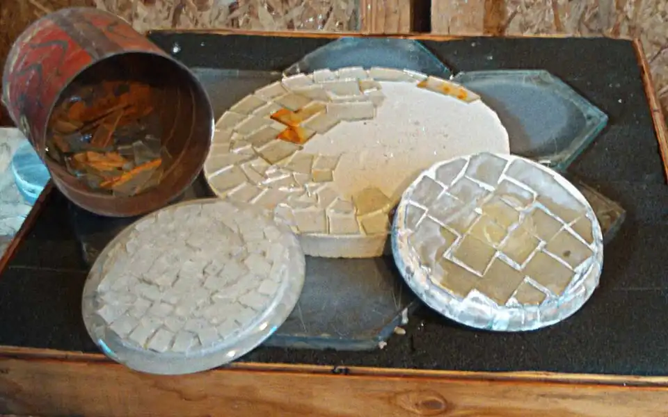 Probably the easiest material to use for the grinding surface is broken glass. Ceramic tiles can be used, as can washers, pennies, flattened marbles, decorative stones. Each will respond to the grind, each will grind in a particular way. Any of them are a valid choice.