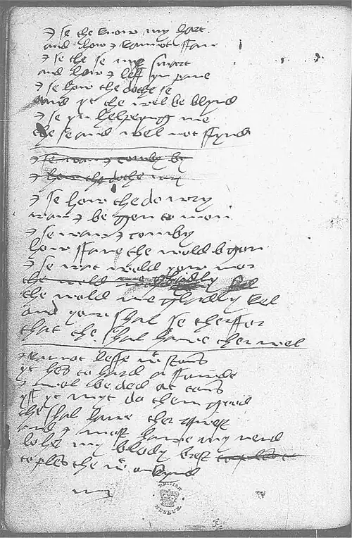 Written in Mary Shelton's hand, this poem remains unattributed. The poem is an adaptation of “The louer refused of his loue imbraceth death,” a poem which appears in Tottel's Miscellany as item 207.[1] A letter that resembles a "w" follows the poem, but scholars have not attributed this poem to Sir Thomas Wyatt. The initial can also be interpreted as an “m,” which may be an indication that the poem was authored by Mary Shelton.