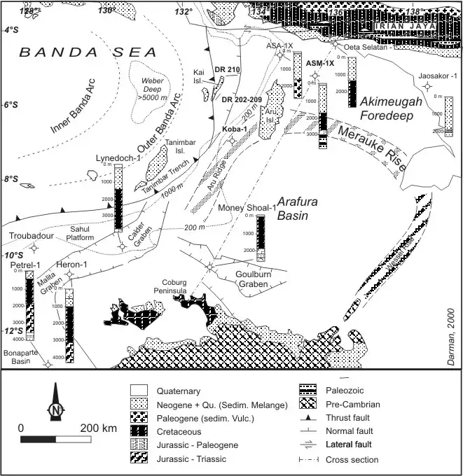 The Arafura Sea is a continental shelf area situated between Irian Jaya (western New Guinea) and the northern part of the Australian continent. To the north, it is bordered by the Tertiary collision zone between the Australian craton and the northern Irian Jaya island arc, while to the south, it adjoins the stable Australian craton. The westerly extension of this area is vague, but can be taken approximately to the eastern margin of the Tanimbar Trench in the south and Aru Trough in the north. To the east, the Arafura Sea forms a stable continental shelf which has suffered little from the intense compressional events at the margins. Episodes of rifting and basin formation are recorded in Paleozoic and Mesozoic sequences, the effective boundary is provided by a Precambrian structural high, the Wessel Rise (Figure 1). The bathymetry of the Arafura Shelf exhibits depths of between 50 and 80 m (160 and 260 ft), but deeper parts down to more than 600 m (1,970 ft) occur at the edges. The east-southeast trending Merauke Ridge across the Aru Islands separates the Arafura depression from a narrower foreland basin in the north, so called Akimeugah foredeep.