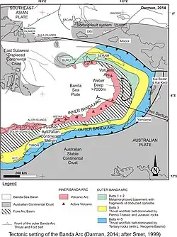 Plate tectonics theory which predict the presence of an accretionary wedge, composed of distal sediments scraped from the ocean floor at the inner side of the arc. At this place, however, de Smet (1999) found continental basement rocks and Early Mesozoic continental sediments. The situation is explained as the result of an inversion process of the Australian continental margin during the Neogene plate collision between Australia and the Banda subduction zone. De Smet (1999) concludes that the Outer Banda Arc is not an accretionary complex, but instead the compressed northern rim of the Australian continent. The load of Australian continental margin sediments that accumulated during the Mesozoic and Tertiary is pushed up on the back of crustal blocks of continental basement to form the present islands and mountains of the Outer Banda Arc. However, no evidence for involvement of Australian basement is found. All the ages of metamorphic rocks in Timor is pre-Jurassic (Banda Terrane) or Miocene-Pliocene).